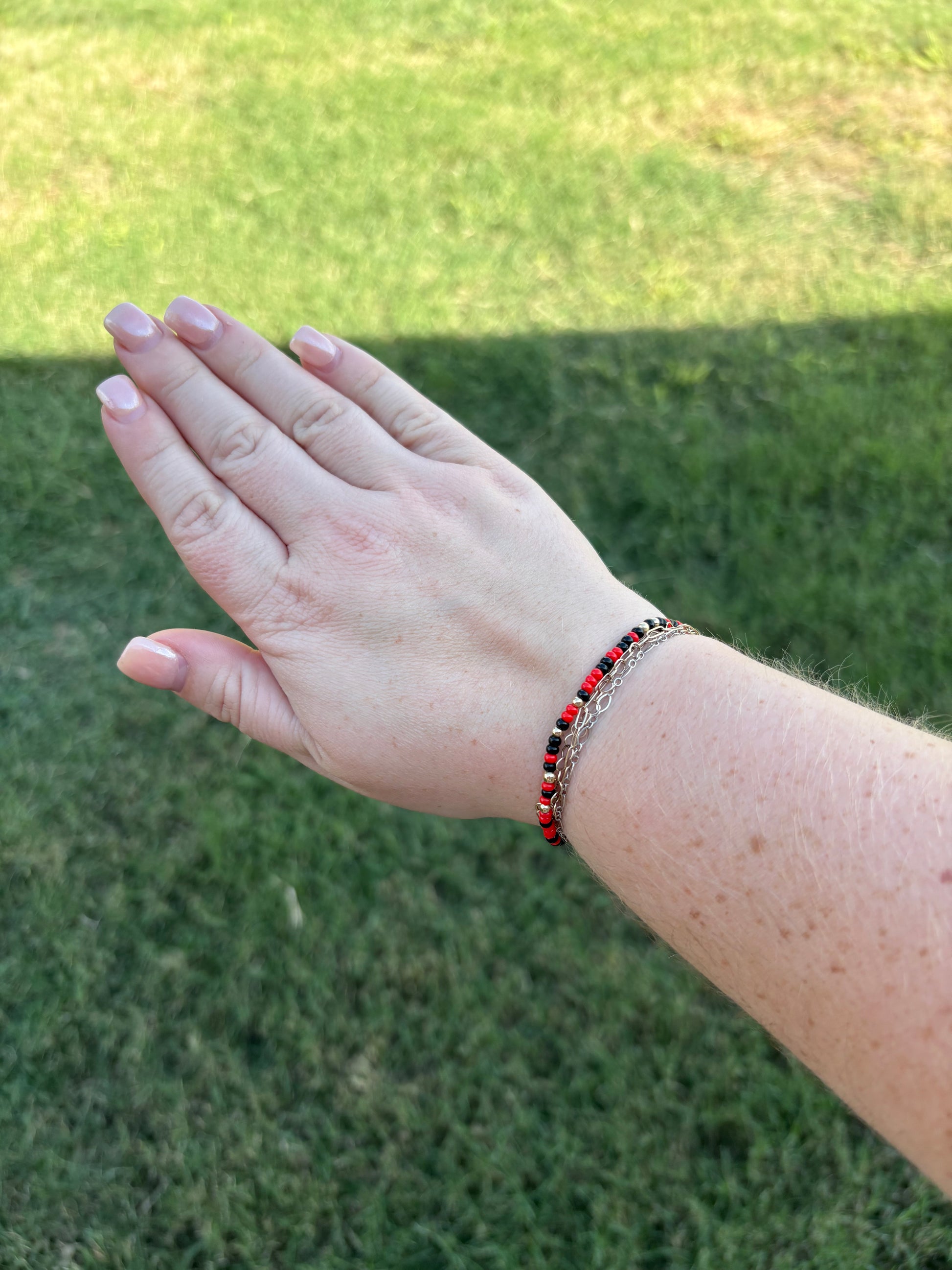 A gameday girl's dream! This 14K gold filled bracelet with red and black beads is waterproof, sweatproof, and fun-proof!