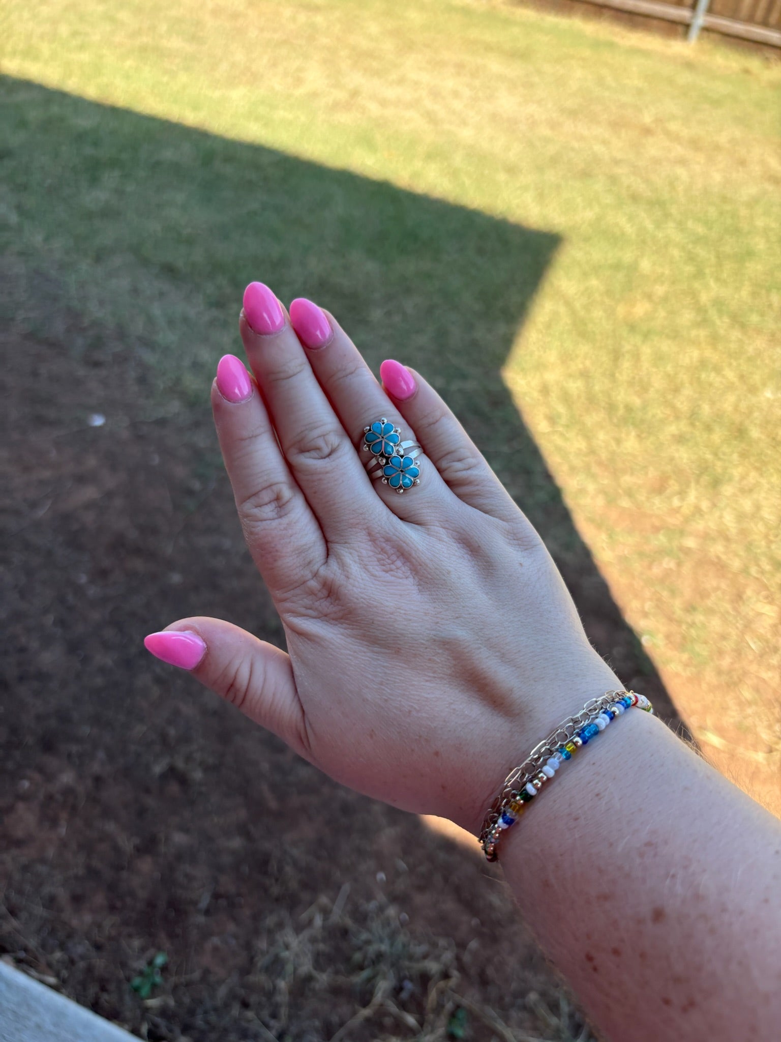 Turquoise Double Inlayed Flower Cluster Ring - SIZE 8